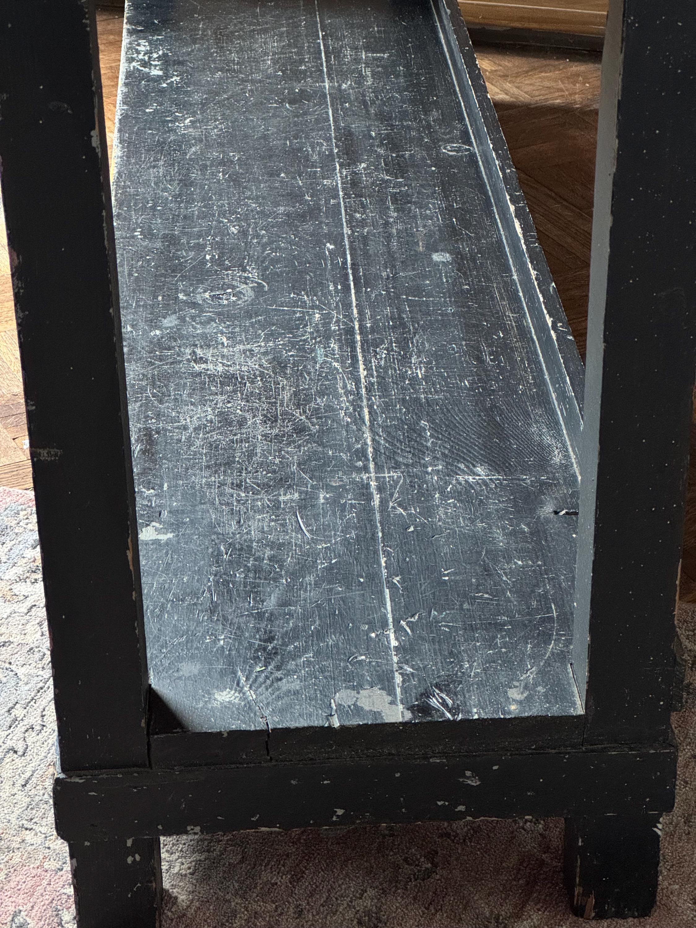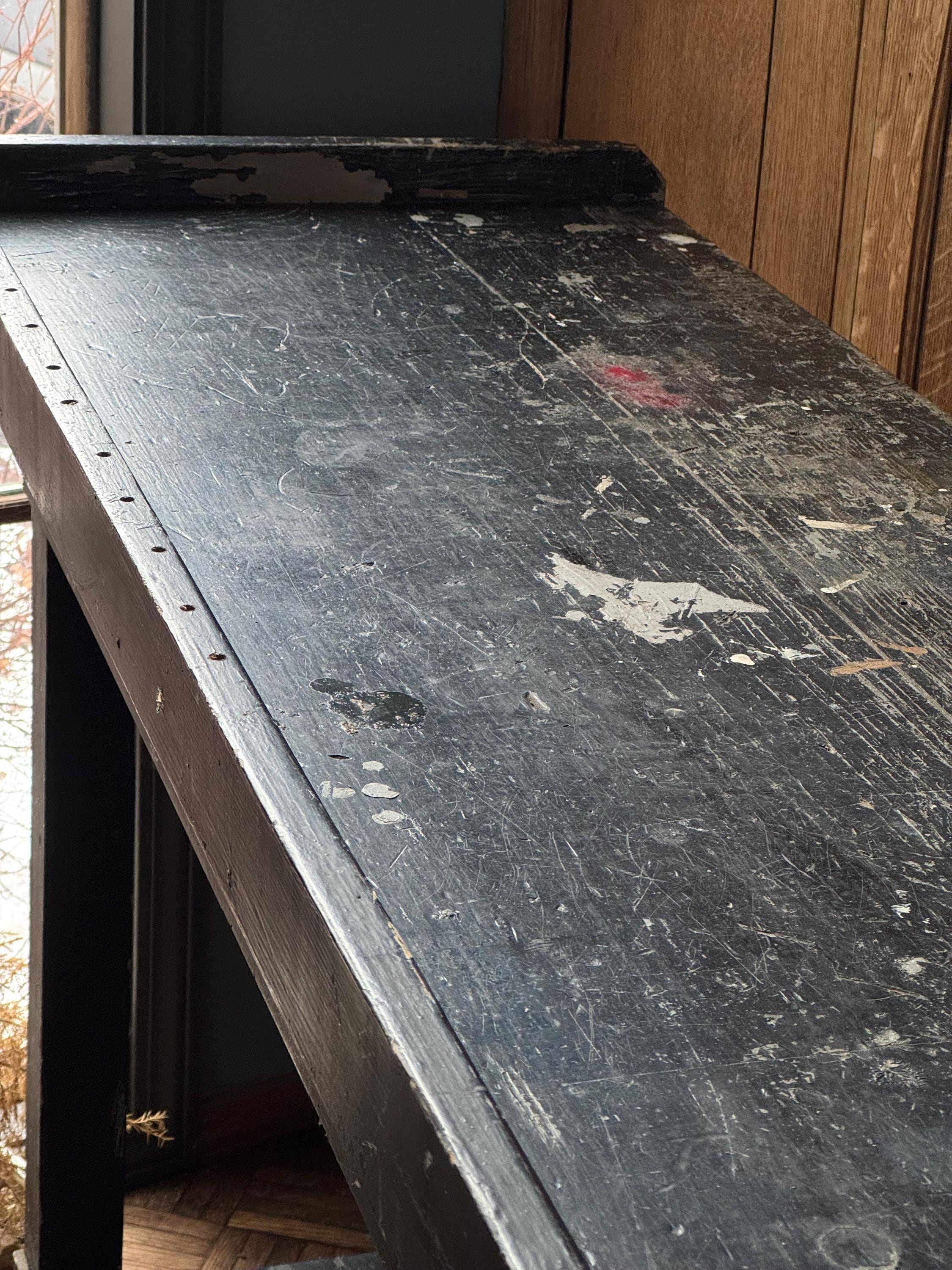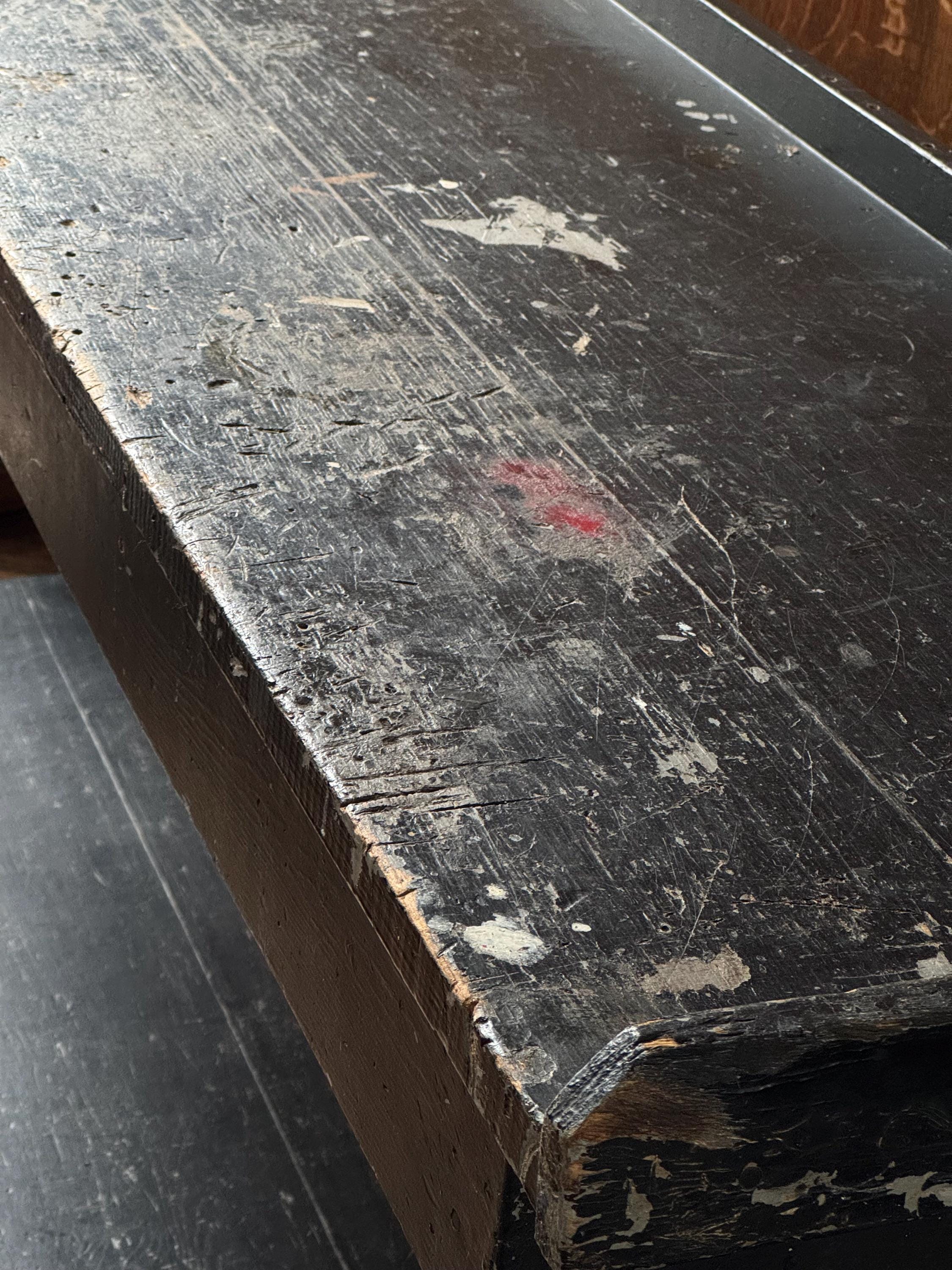Scuffs, scratches, dings, dents, nicks, chips, splits in wood, old nail holes, saw marks, staining, wear to finish, layers of old paint, paint splatter, etc.